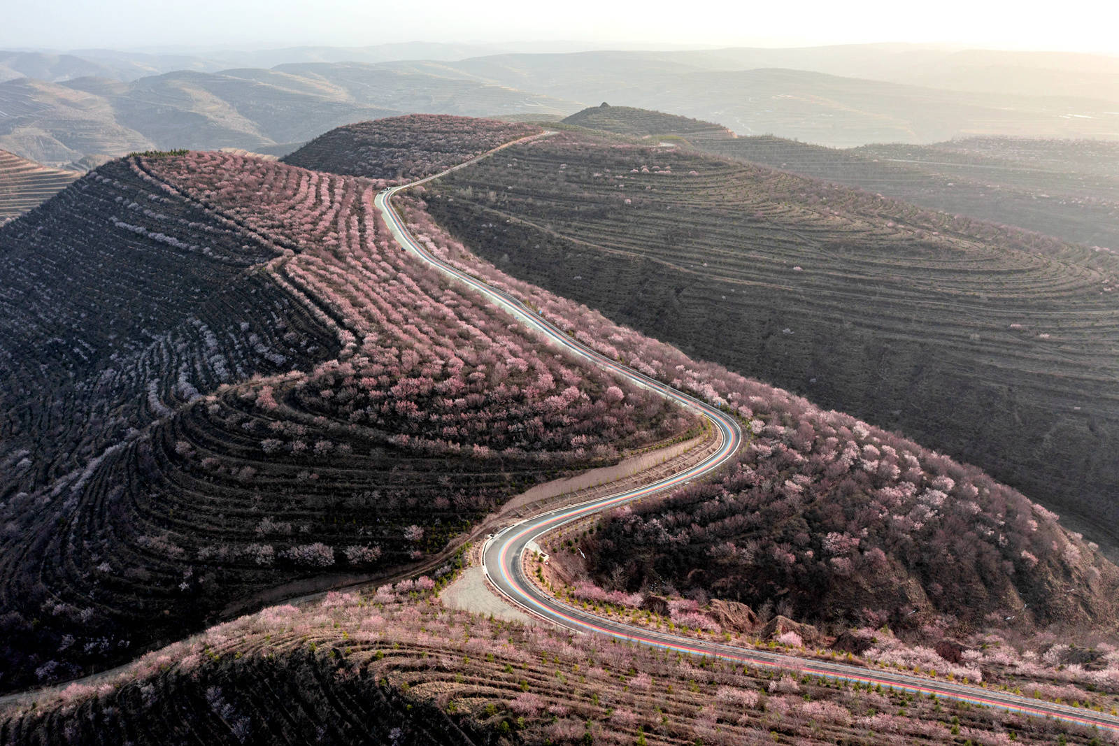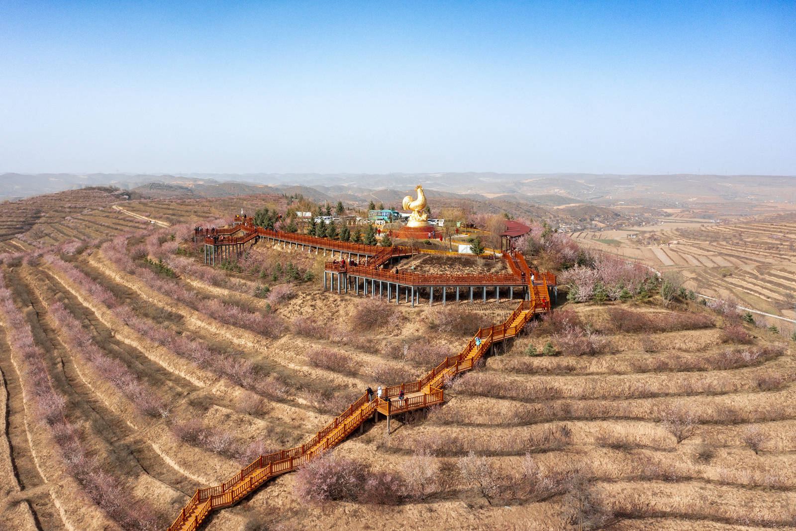 山花笑迎客,行走在彭阳,公路两边、田间地畔,漫山遍野粉红色的山花竞相争艳。来到金鸡坪梯田公园,放眼望去,游客络绎不绝,梯田从沟底蔓延至山头,层层叠叠,美不胜收。