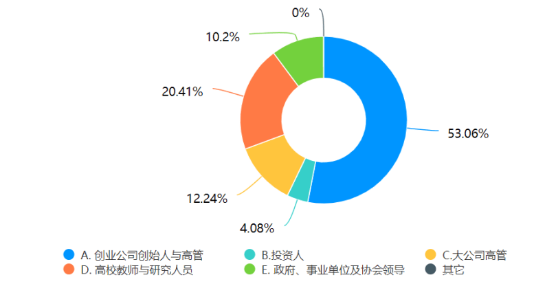 创业者在创业前普遍任职于公司或者企业,占到40.82%,创业前是公务员或者事业单位职员的比例为10.2%,教师或科研人员的的比例为8.16%,学生和其他比例一样占到了4.08%,军人的比例占2.04%。