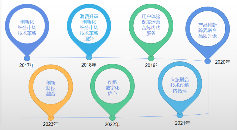2017年的关键词为“创新化、细分市场、技术革新”,2018年的关键词为“消费升级、创新化、细分市场和技术革新服务”,2019年的关键词为“用户体验、深度运营、苦练内功和服务”,2020年的关键词为“产品创新、跨界融合、品质升级”,2021年的关键词为“文旅融合、技术创新和内循环”,2022年的关键词为“创新、数字化、信心”。2023年的关键词为“创新、科技、融合”。(见图17)