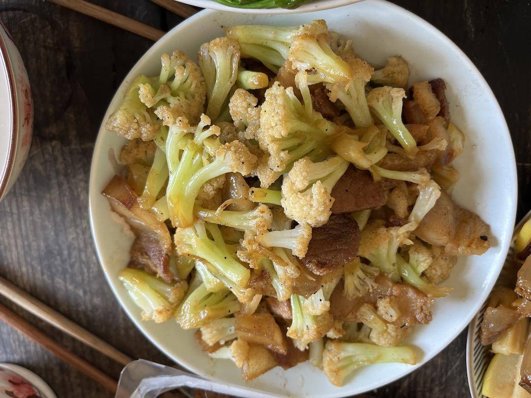 这个菜柳看起来不是特别的鲜嫩,个头也比较小,应该是家里自己种的,制作的时候,搭配了一点猪肉一起炒,这个也是当地的经典做法。