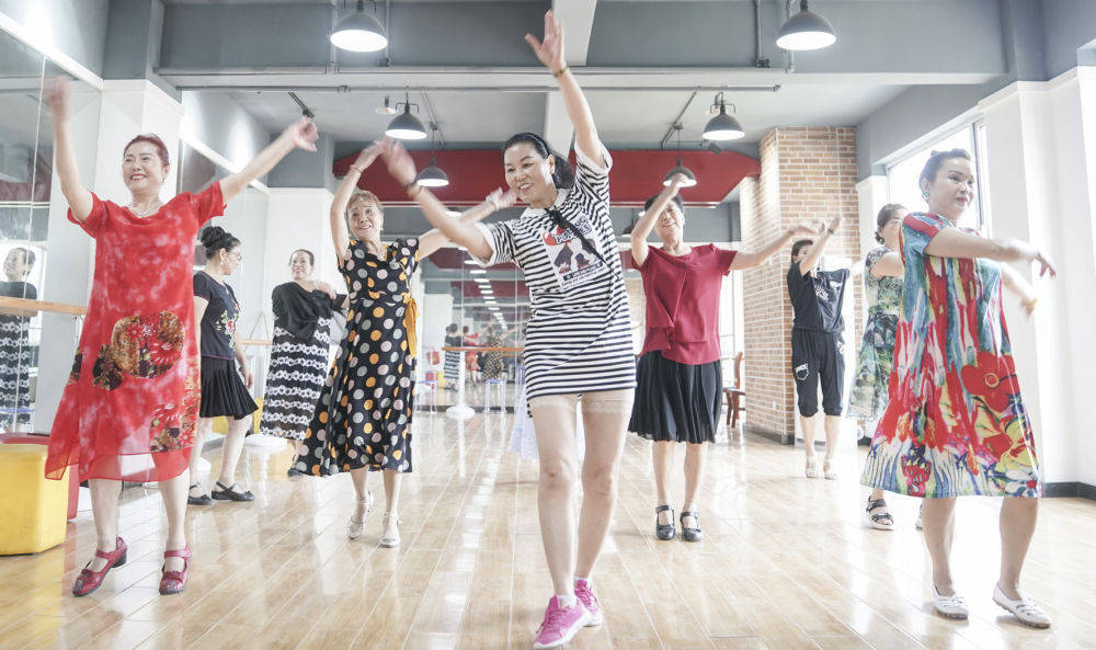 居民们在武汉市青山区棚改安置小区青和居社区活动中心练舞(2019年7月30日摄)。新华社记者 程敏 摄