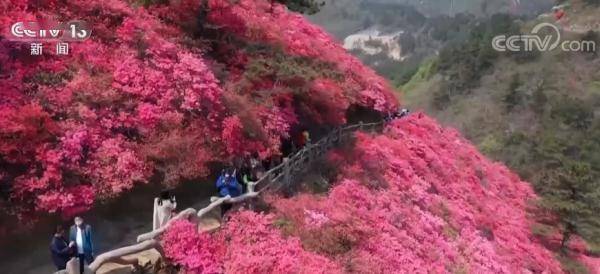 央视网消息:上周末,湖北多地天气晴暖,最高气温普遍升至20℃以上。在武汉黄陂云雾山,漫山遍野的杜鹃花携着盎然春意盛放,吸引了不少游客到来。