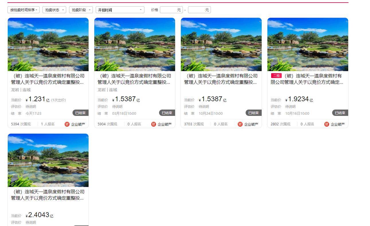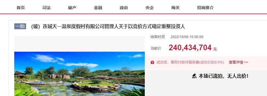 不过就是这么一大有名的温泉度假村,不知道是因为三年情影响还是什么原因,也是面临了破产,早在2022年的时候,连城天一温泉度假村的投资运营企业连城天一温泉度假村有限公司就在阿里法拍网进行了以竞价方式确定重整投资人的拍卖。但是起拍价2.4亿元起,可惜最终没有接盘的人报名,以流拍而告终。