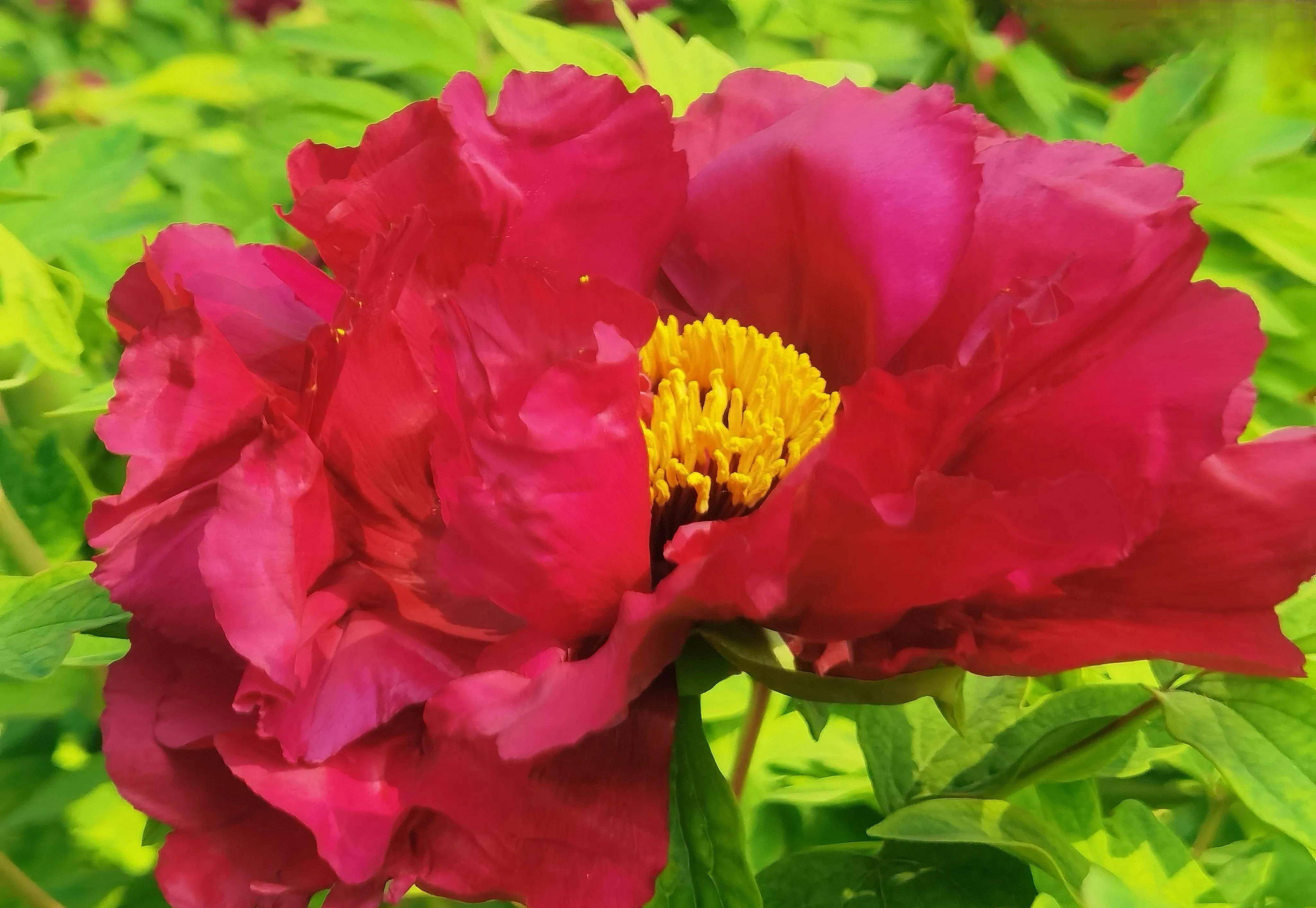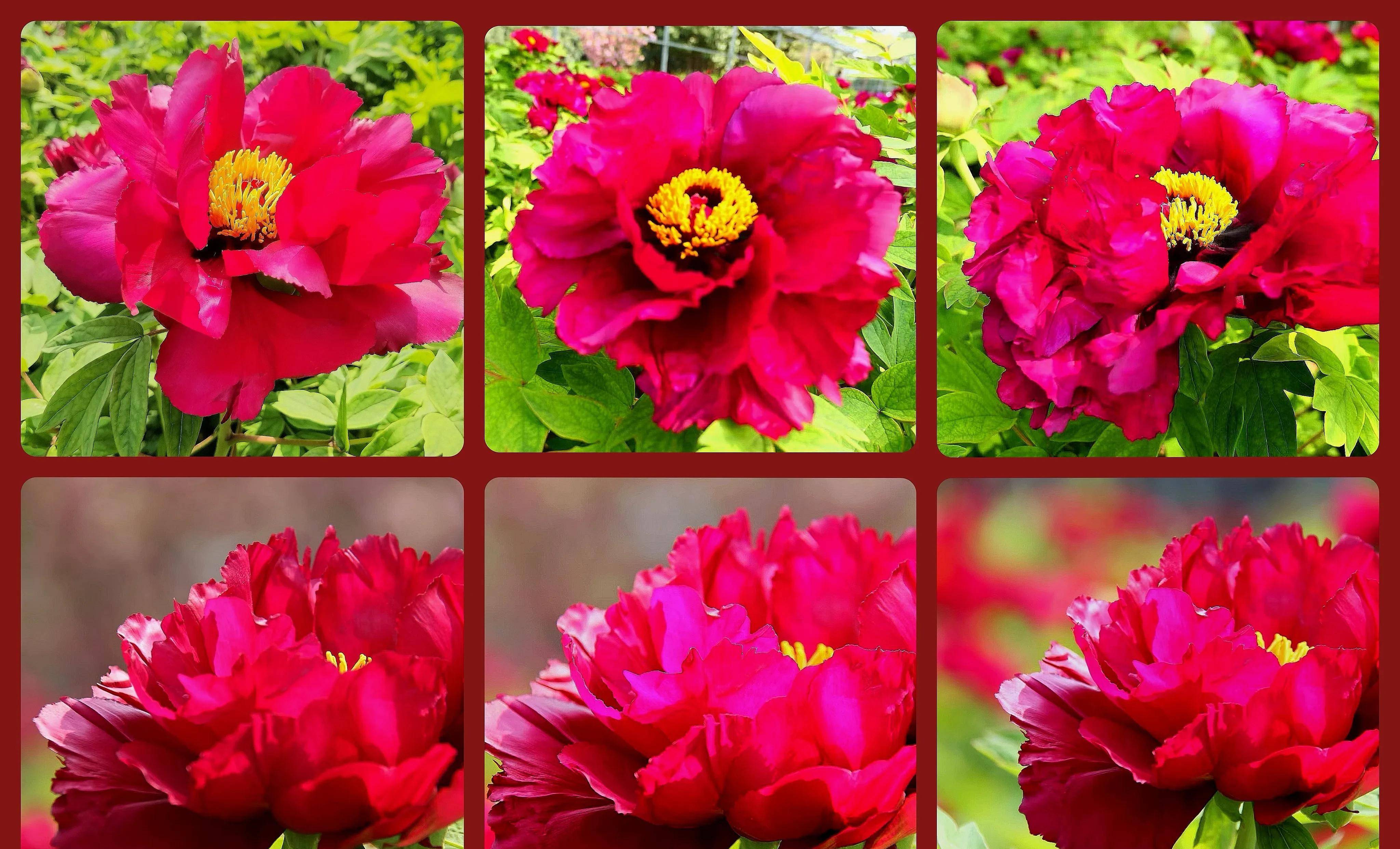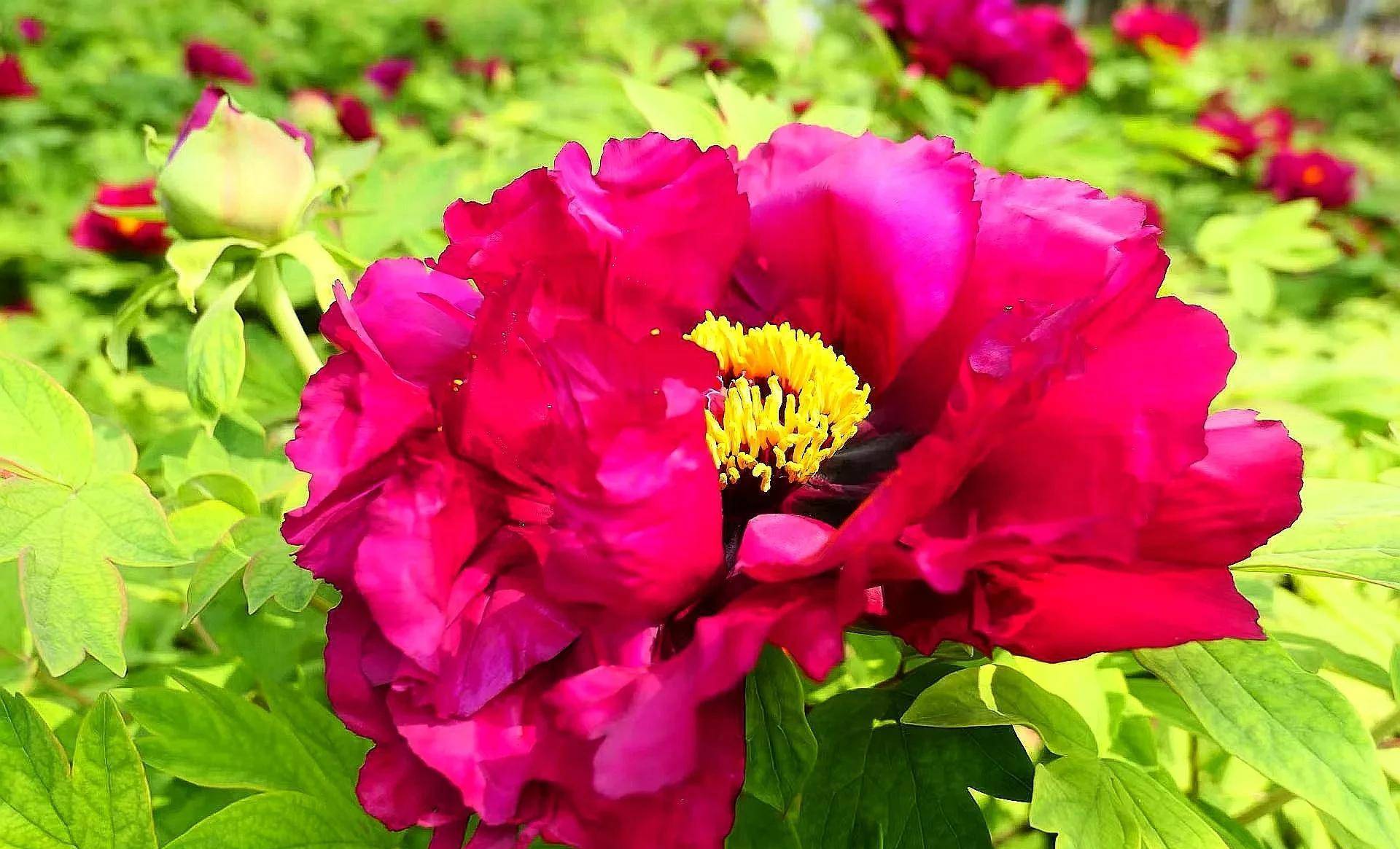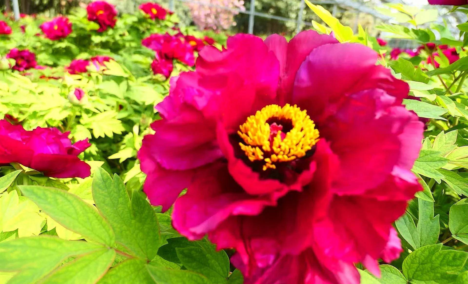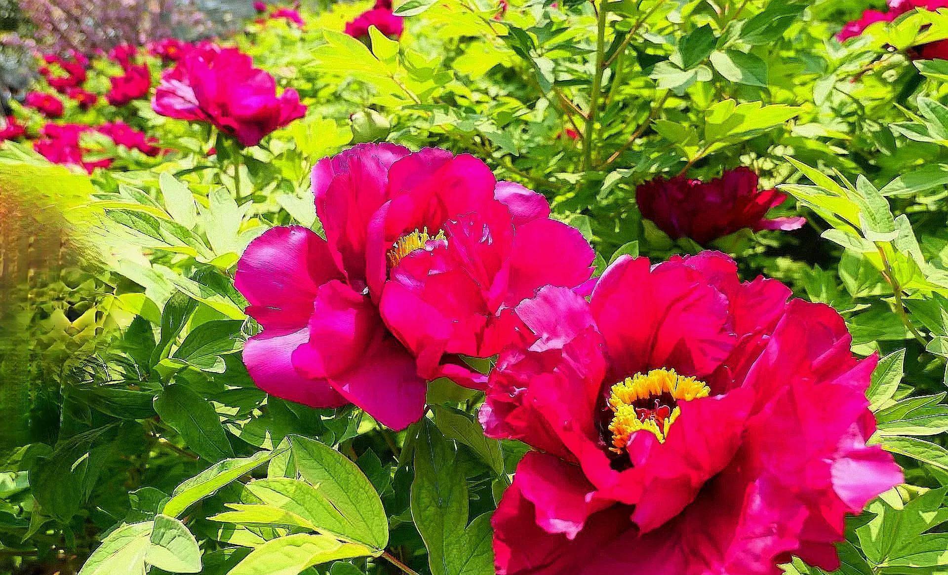 洛阳中国国花园内的一处黑海撒金牡丹,姐妹比容颜,看谁最黑红!