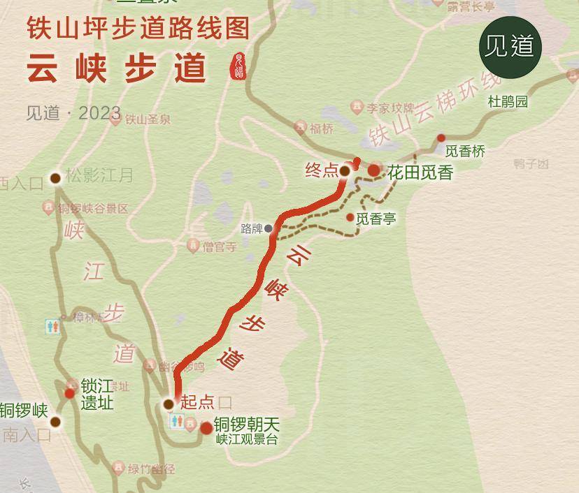 云峡步道起于铜锣朝天(峡江观景平台),止于花田觅香,步道宽约2米,长只有1公里多。