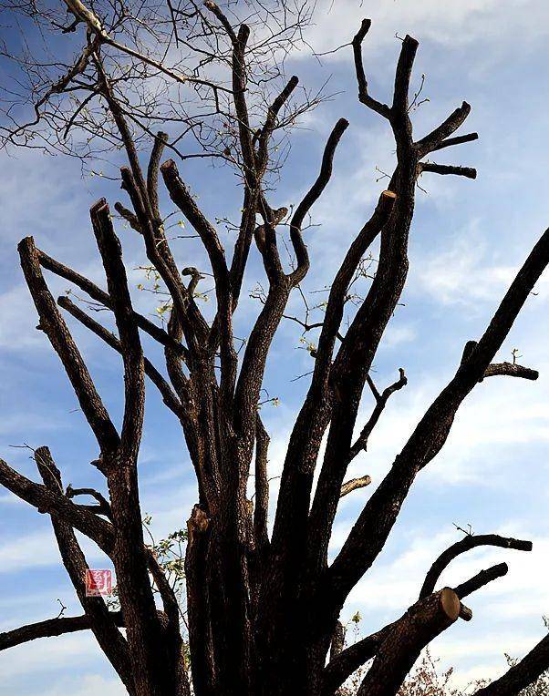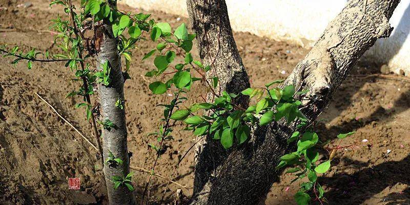 除此之外,园内还有棵杏树身上生长桃树的奇观。作为“母亲”的杏树,从根部向上自然分开,每个分枝直径约有30公分,形状犹如巨型弹弓;而它的“儿子”桃树,则从杏树的根部向上直立生长,直径约有15公分,两棵不同树种相辅相成,自然和谐。