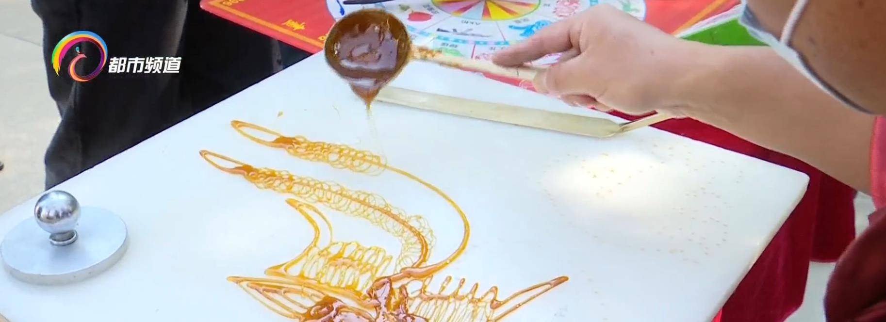 而在另一边的糖画区,在师傅的一双巧手下,一只金鸡栩栩如生,充满童趣。