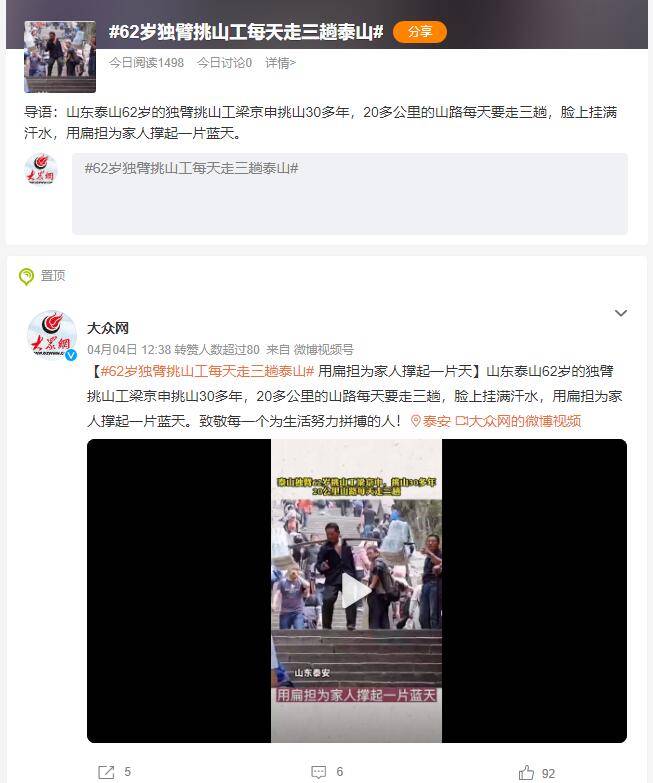 #62岁独臂挑山工每天走三趟泰山#