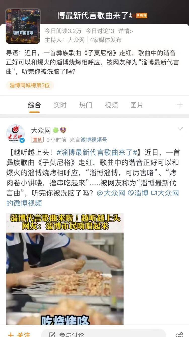 近日,一首彝族歌曲《子莫尼格》走红,歌曲中的谐音正好可以和爆火的淄博烧烤相呼应,“淄博淄博,可厉害咯”、“烤肉卷小饼喽,撸串吃起来”……被网友称为“淄博最新代言曲”