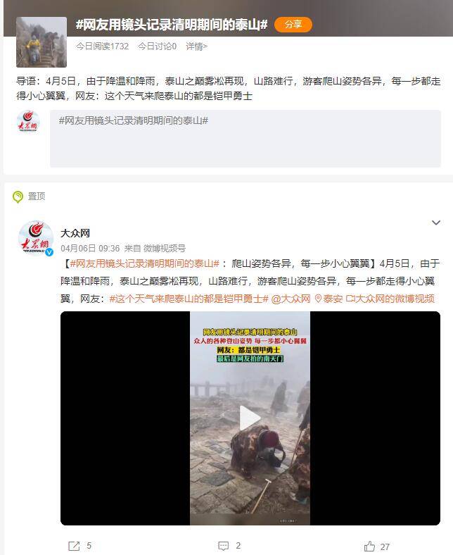 4月5日,由于降温和降雨,泰山之巅雾凇再现,山路难行,游客爬山姿势各异,每一步都走得小心翼翼,网友:这个天气来爬泰山的都是铠甲勇士。