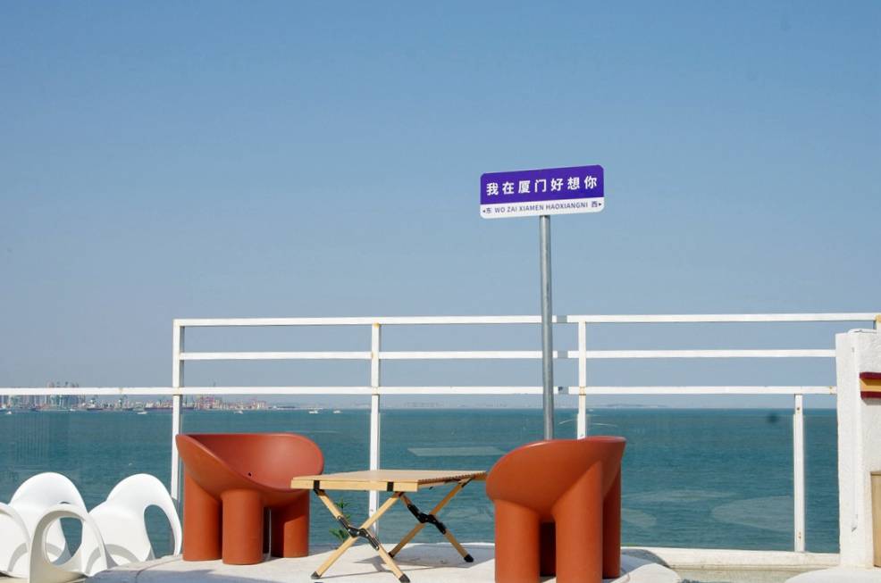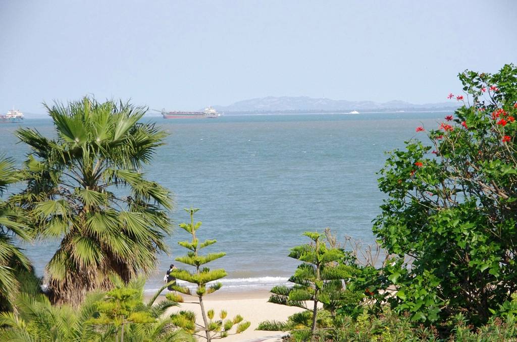 在闽南大院靠海的露台上,有很好的角度看海,如果用大号望远镜天气好的时候可以看到远处的金门。(远景的岛屿就是)