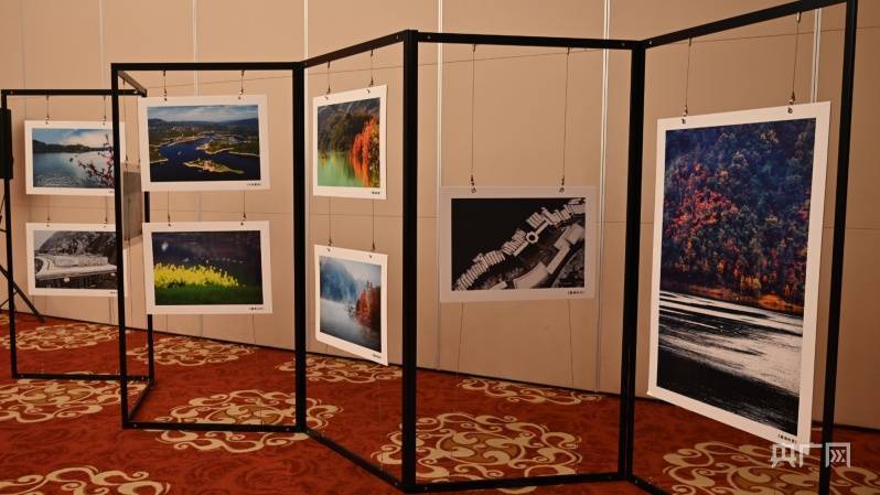 现场展陈的瀛湖景区摄影作品(央广网记者 王进文 摄)