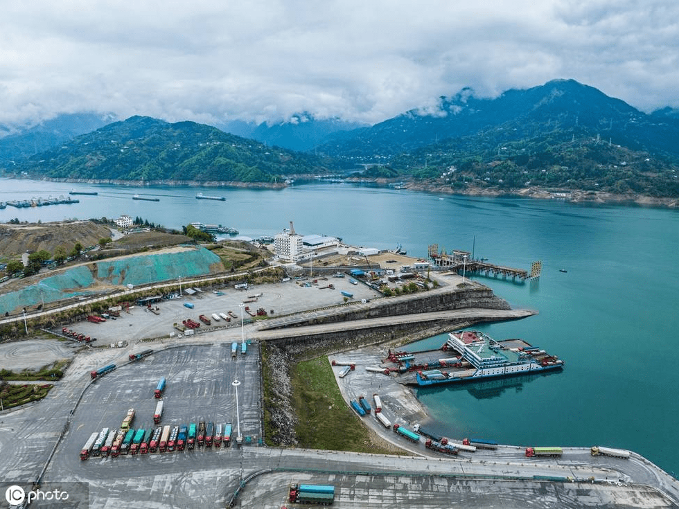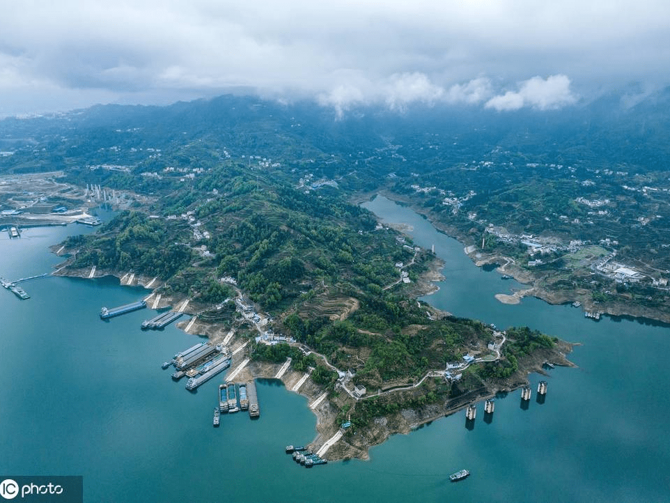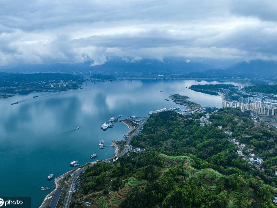 两岸山峦叠翠,大坝横卧江面,构成一幅三峡青绿水墨画卷。