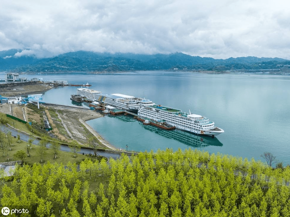 湖北省宜昌市,游轮停靠在秭归县木鱼岛外沿三峡旅游港。