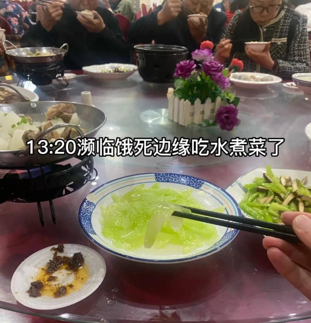 这两站折腾下来,就已经是13点20分了,真是饿坏了,女大学生跟大爷大妈们挤在一张大桌上,吃得比较清淡,主要是水煮菜。
