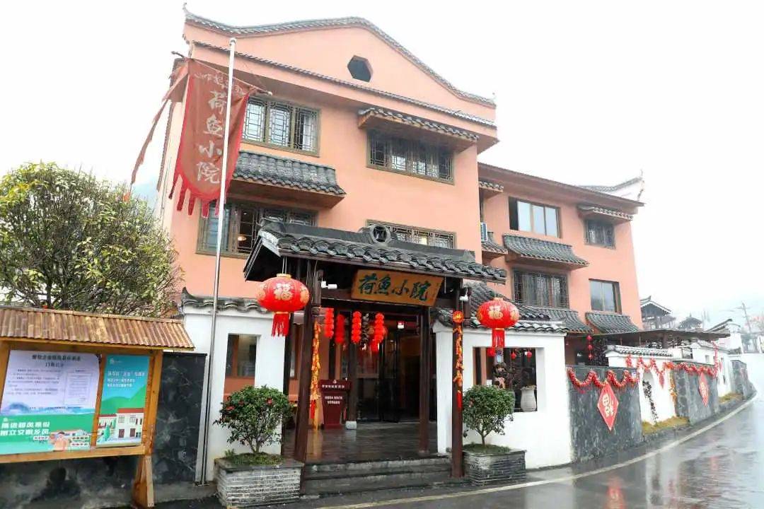 刘显华的荷鱼小院,离翁井村荷花池不到500米,门前溪水潺潺,两旁的腊梅和碧桃次第盛放,红墙灰瓦的三层小楼,在细雨蒙蒙中展现着烟雨乡村的独特风韵。门外曾经尘土飞扬的土路不见了,一条宽阔、干净的沥青路直通村外。
