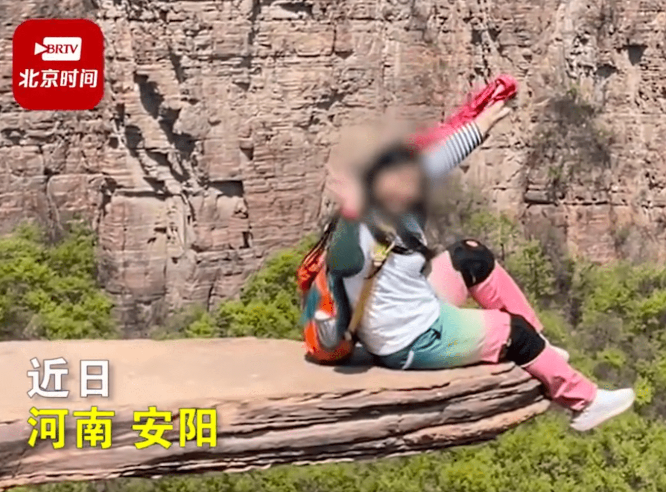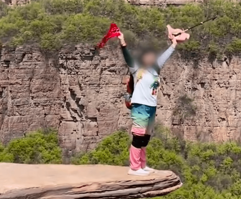 视频内容显示,一名女子在未做任何保护措施的情况下,在石头边缘挥舞双手,作出各种姿势,拍照打卡。