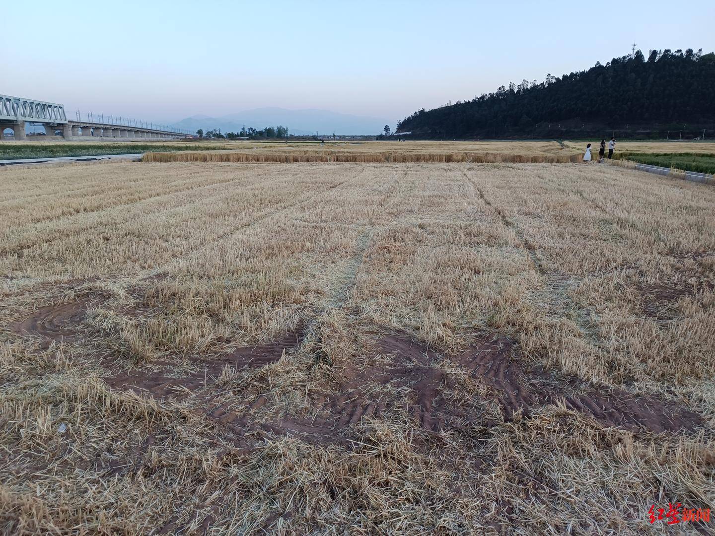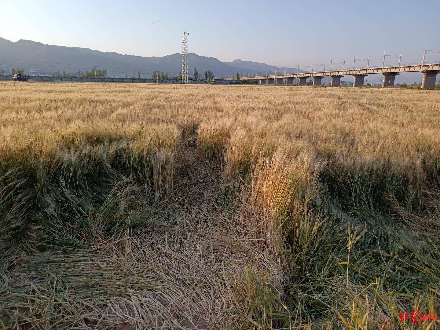 红星新闻记者在现场看到,几乎每一块成片的麦地都有被踩踏的痕迹,而且麦田中还被踩出了一条条小道,有的地方麦子成片倒下,特别是靠近公路的麦田踩踏得比较严重。