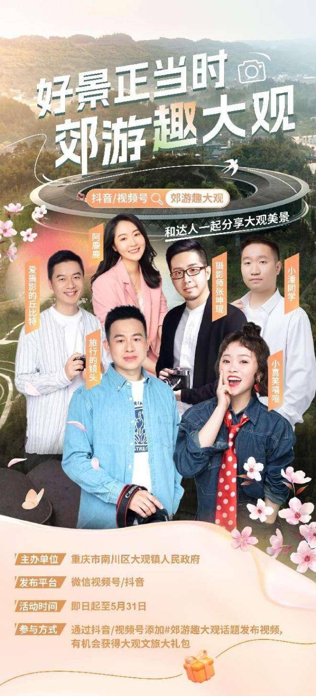 为进一步增强大观文旅品牌影响力,3-5月,重庆市南川区大观镇人民政府将举行“好景正当时 郊游趣大观”达人行活动,知名网红摄影达人齐聚大观,用镜头记录美丽大观的光影瞬间。
