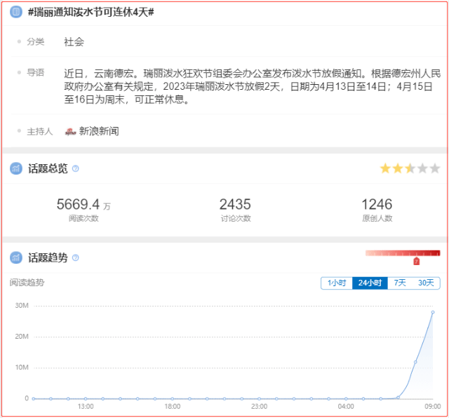 早些时候,云南德宏州瑞丽市泼水狂欢节组委会办公室发布放假通知:根据德宏州人民政府办公室有关规定,2023年瑞丽泼水节放假2天,日期为4月13日至14日;4月15日至16日为周末,可正常休息。