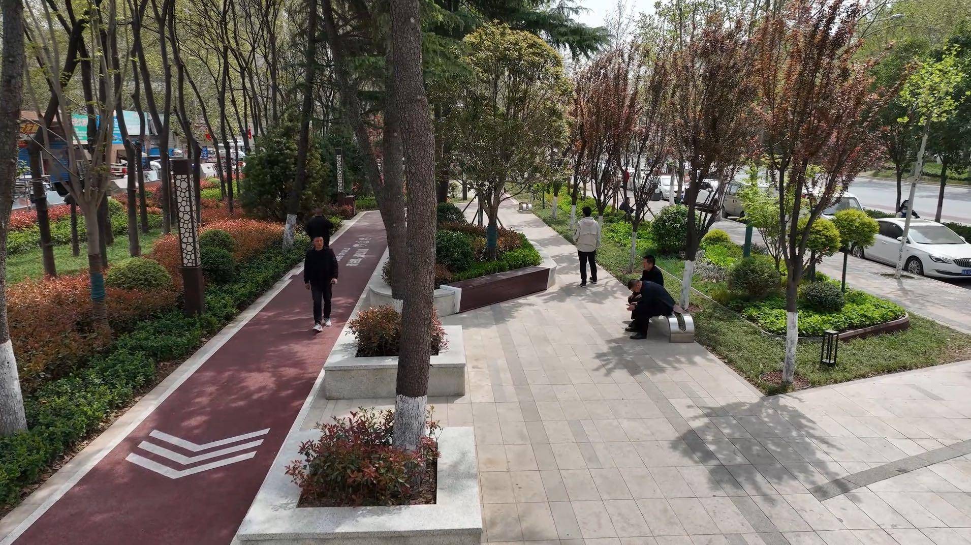 4月9日,记者来到位于枣园西路北侧的厨具市场“口袋公园”,映入眼帘的是一片绿意盎然的美景,一个新建的“口袋公园”格外显眼,园内高矮各异的多处乔灌木搭配的相得益彰,健身步道和休闲坐凳一应俱全,很多居民带着小孩在其中休闲玩耍,晨练遛弯的人也都徜徉其中。居民马先生说:“小孩在这儿玩耍特别的安全,我们放心的很,这给我们提供了很大的便利。”