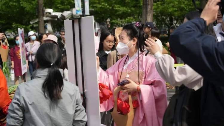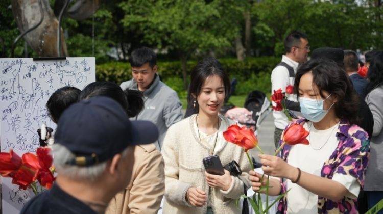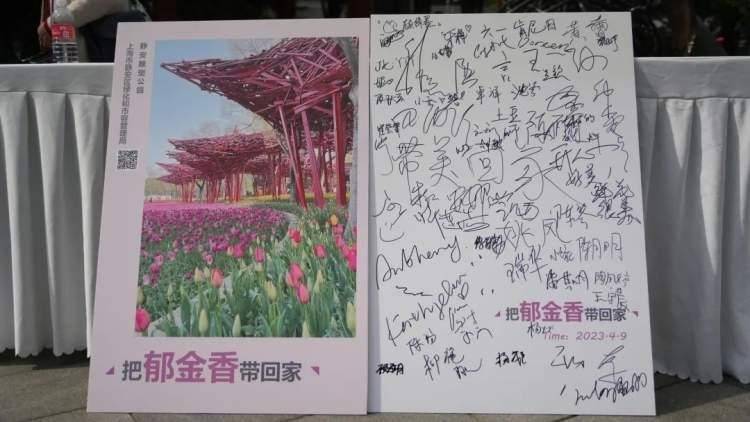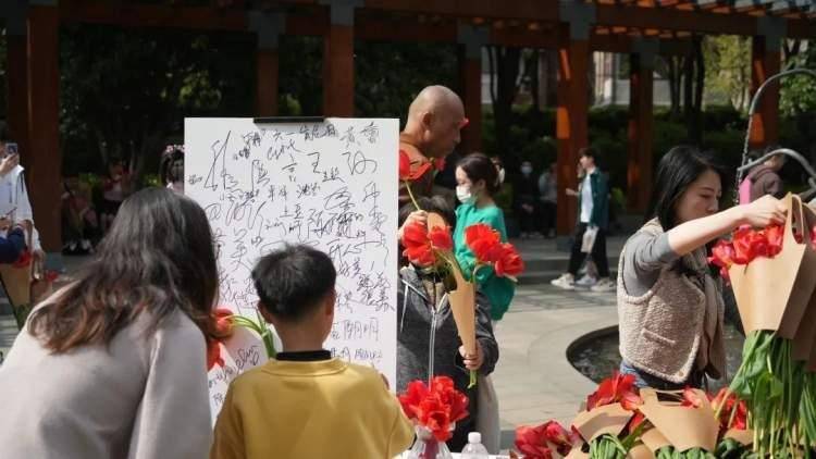 活动现场领取郁金香的流程非常简单,市民游客只需扫码关注“静安绿化市容”微信公众号,便可领取一份郁金香鲜切花。领到花后,还可以在留言板上签名,或写下想要诉说的心声。