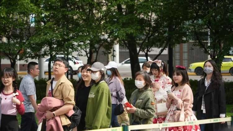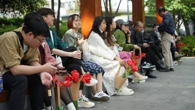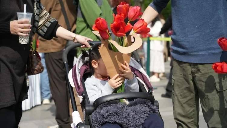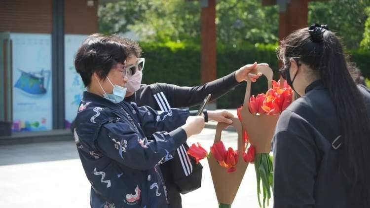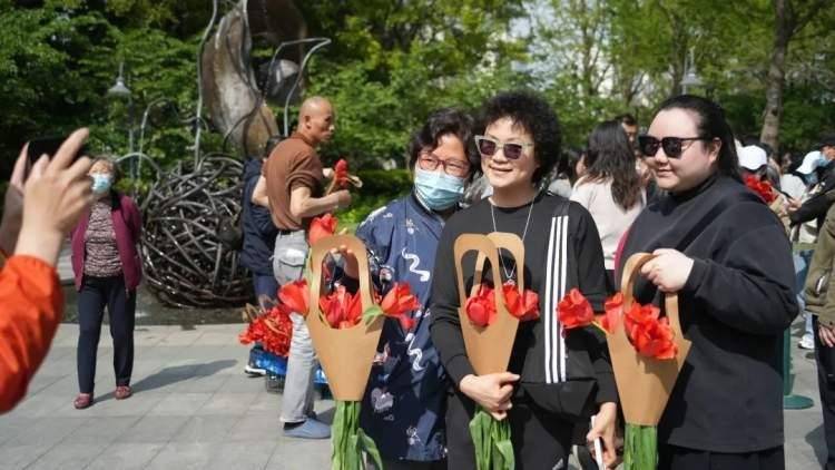 来往的市民游客人潮如织,到了午后,园中的“把郁金香带回家”活动,更是吸引了众多游客排起了长队。