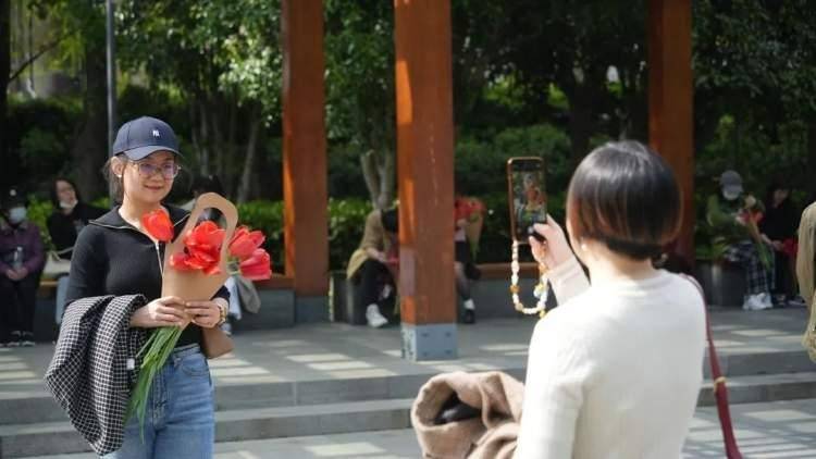在现场,陈女士一行正拿着手机,拍下自己刚刚领到的郁金香。陈女士也是家住附近的居民,在看到活动预告后,和女儿、好友一起安排好时间,提前来到雕塑公园排队领花。