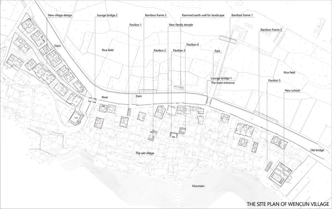 文村沿溪而建,背靠连绵山脉,呈带状分布。村东两段是老村,顺着溪流的方向,分出上村和下村。村西一段,是王澍新建的村子,在溪水的最上游。