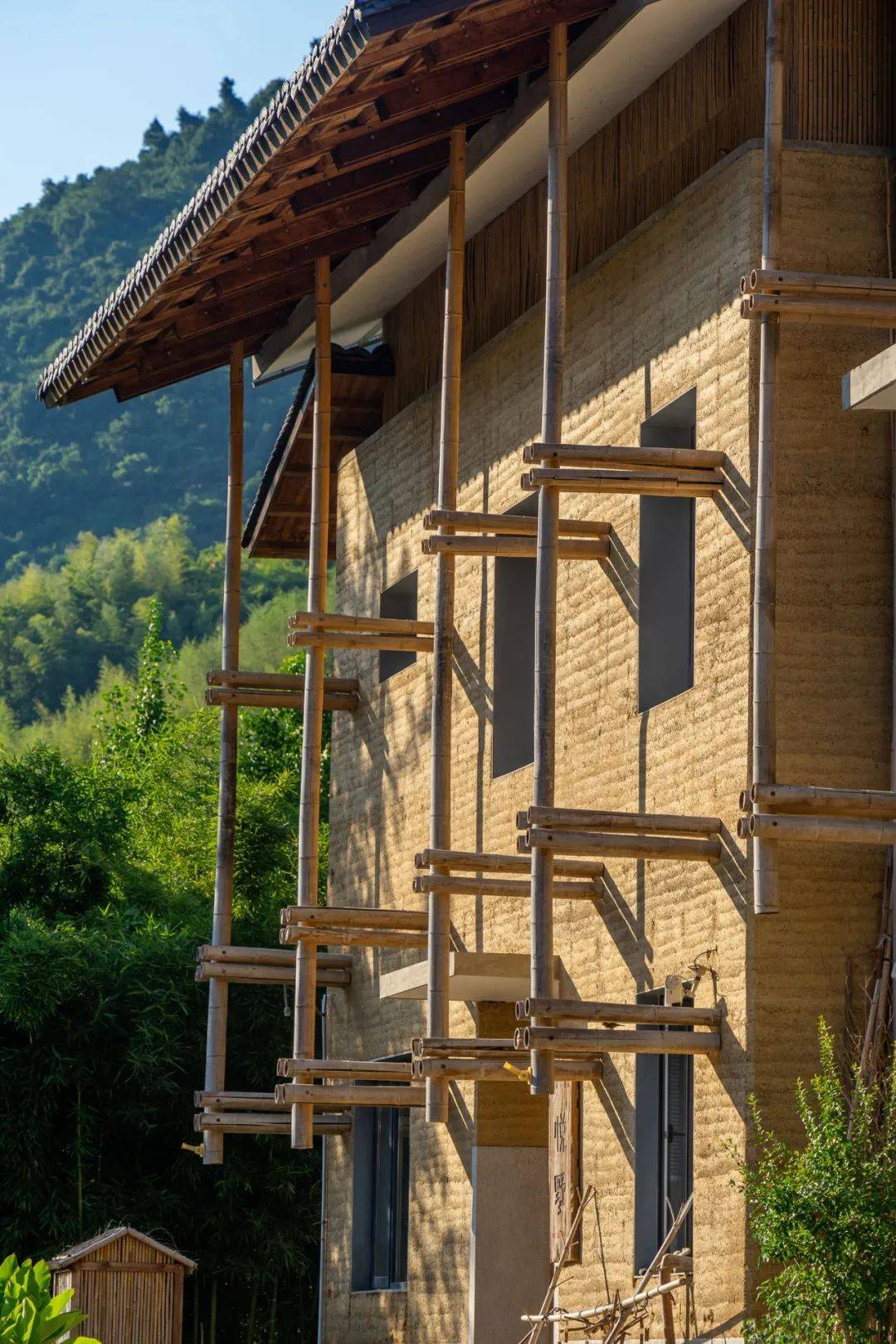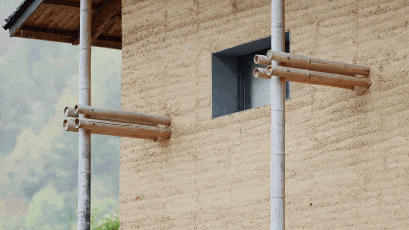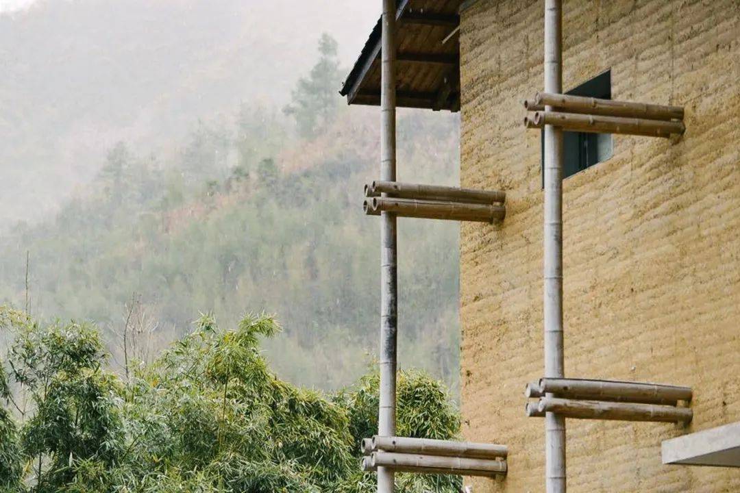 夯土墙+竹工艺之家,墙面上的竹,是屋顶的支撑结构