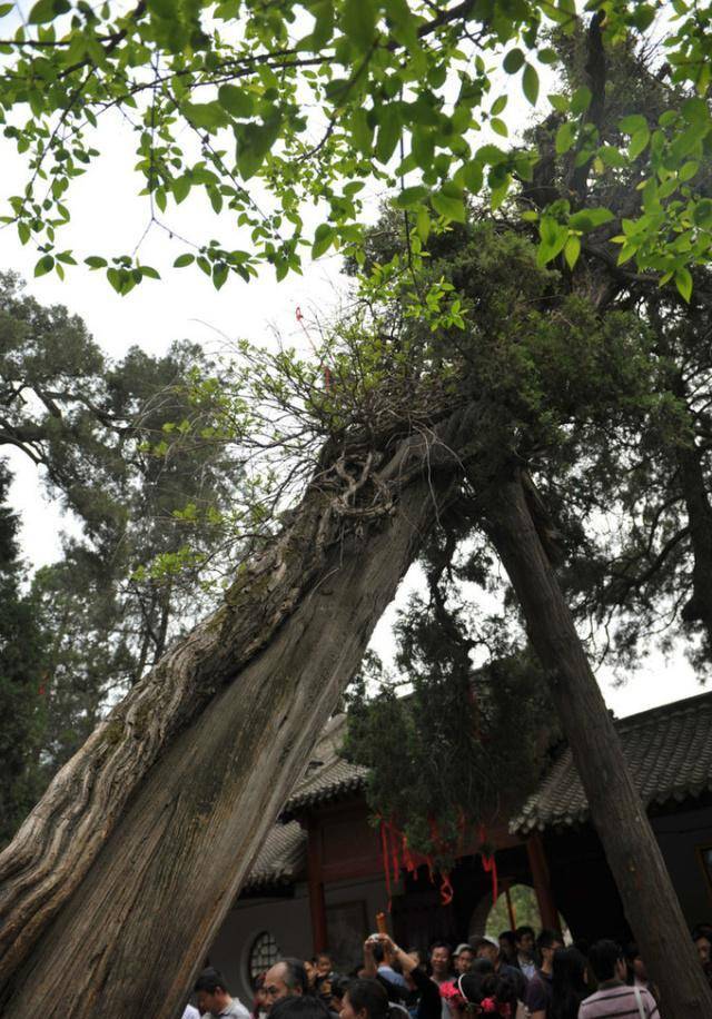 图为白马寺内的古树,传说是玄奘法师亲手所种,历经千年风雨,健壮不在。树干被管理人员用木头顶住,但依旧枝繁叶茂。