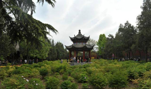 白马寺内,除了寺院庙宇,还有春色满园。牡丹,洛阳之盛产,随处都会有成片成园。园中虽未成繁盛,也不乏人们的漫步与观赏。园中秀亭,俊俏而立,试想万紫千红时,该是何等美景!