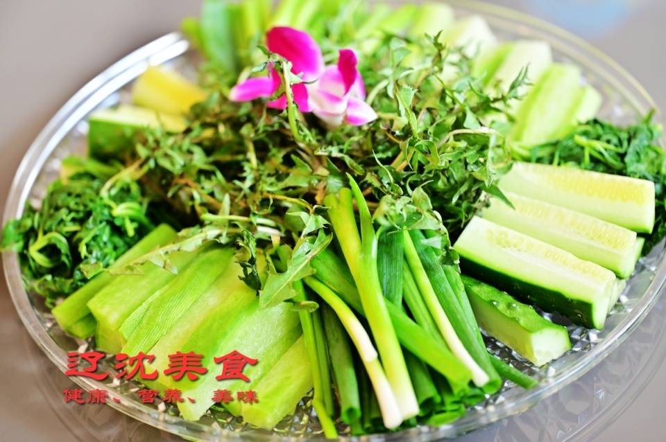 东北大丰收春季版本:山野菜加上黄瓜香葱水果萝卜还有水黄瓜,山野菜蘸鸡蛋酱。