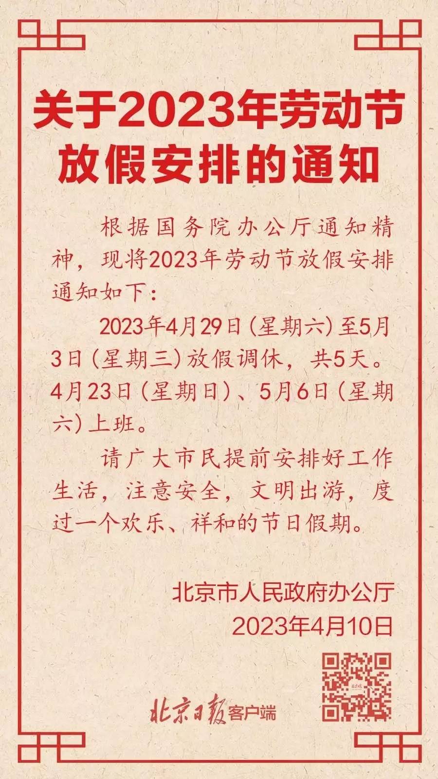 2023年4月5日清明节刚刚过去5天,北京市人民政府办公厅今天就2023年劳动节放假安排正式作出通知:调休放假共计5天,从2023年4月最后一周周末(2023年4月29日,30日)+5月前三天(2023年5月1日-3日)。调休2天,分别是2023年4月倒数第二周周日(2023年4月23日)和2023年5月第一周周六(2023年5月6日)调整为正常工作日,正常上班。