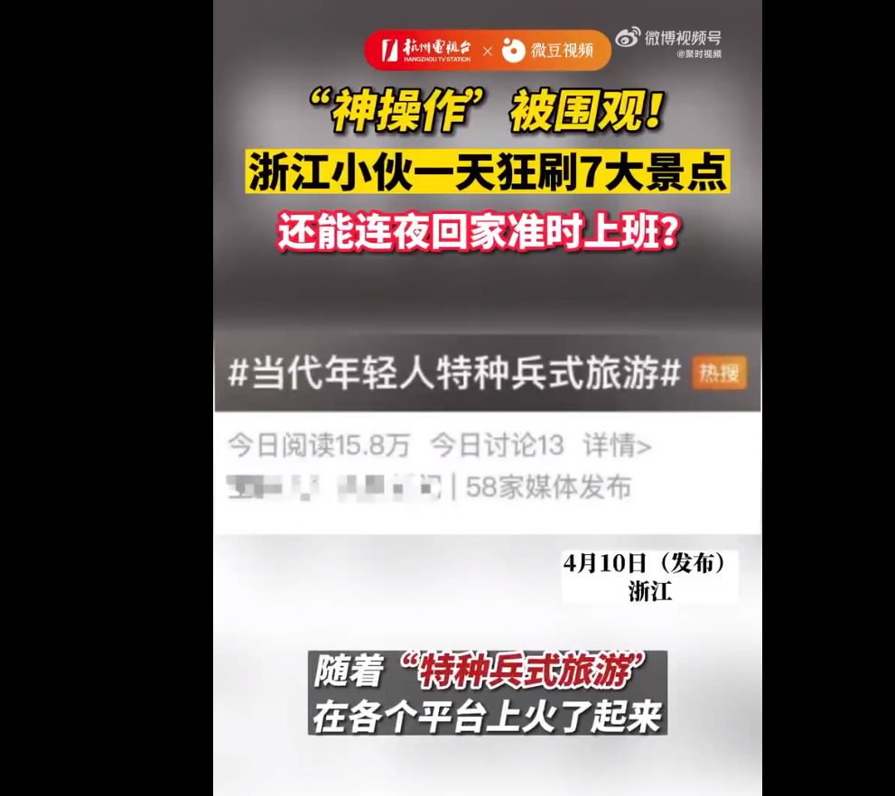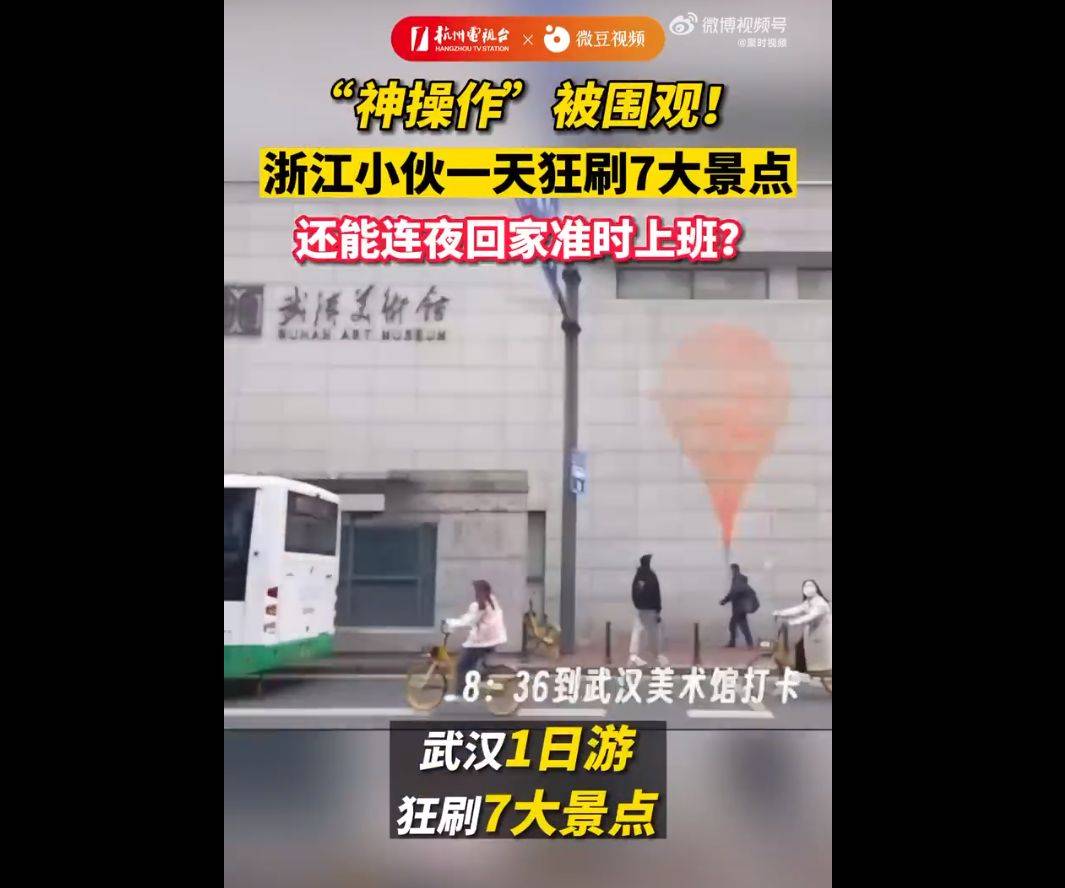 4月10日,浙江。随着“特种兵式旅游”、“报复性旅游”在各大平台上火了起来,在各个社交媒体上,年轻人纷纷晒出旅游经历,其中一个宁波男孩迅速吸晴,武汉1日游狂刷7大景点,次日还能回家准时上班。网友直呼:别说上班,我纯玩都玩不了这么多。