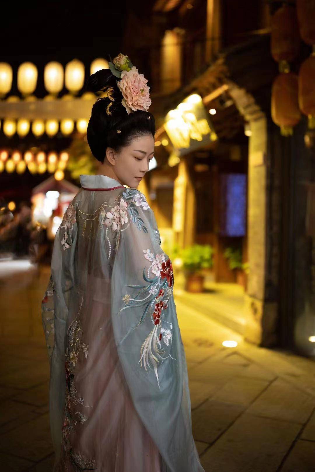 套上立领对襟衫,系上刺绣马面裙,搭上方领对襟袄,身着一身华丽汉服,手提一盏宫灯,腰间一把团扇,或三两相伴,或漫步在古色古香的街巷中,游客仿佛重新步入盛唐的坊市之中。