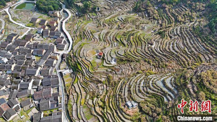 航拍吴峰村,黄墙黛瓦古民居与层层梯田相融。 褚子强 摄
