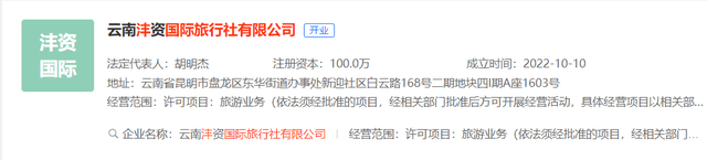 云南沣资国际旅行社有限公司成立于2022年10月10日,注册地位于云南省昆明市盘龙区东华街道办事处新迎社区白云路168号二期地块四I期A座1603号,法定代表人为胡明杰。经营范围包括许可项目:旅游业务(依法须经批准的项目,经相关部门批准后方可开展经营活动,具体经营项目以相关部门批准文件或许可证件为准)一般项目:旅行社服务网点旅游招徕、咨询服务;旅游开发项目策划咨询;园区管理服务;会议及展览服务;信息咨询服务(不含许可类信息咨询服务);票务代理服务;旅客票务代理;休闲观光活动;租赁服务(不含许可类租赁服务);商务代理代办服务;项目策划与公关服务;酒店管理;组织文化艺术交流活动;国内贸易代理(除依法须经批准的项目外,凭营业执照依法自主开展经营活动)。