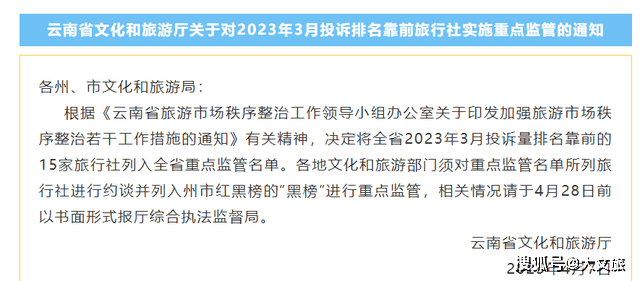 2023年4月7日云南省文化和旅游厅决定将全省2023年3月投诉量排名靠前的15家旅行社列入全省重点监管名单。各地文化和旅游部门须对重点监管名单所列旅行社进行约谈并列入州市红黑榜的“黑榜”进行重点监管,相关情况请于4月28日前以书面形式报厅综合执法监督局。