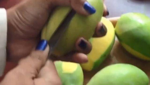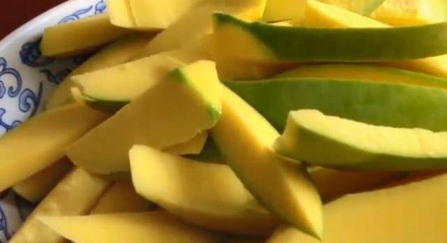 在云南地区,蘸辣椒吃的芒果一般都是图中展示的这种青肉或者微黄肉的芒果,由于这种芒果还没有成熟,所以吃的时候都是比较酸涩的。所以这时候云南的小伙伴们就喜欢切成长条状的,稍微把皮去一下就可以了。处理的方式非常的简单。