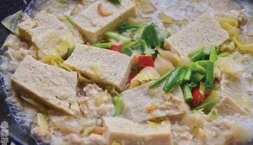 白菜炖豆腐大家都吃过吧?在东北天冷时整个室外就是个大冰箱,豆腐冻过之后炖起来会更入味,在东北除了白菜人们还爱吃白菜腌制的酸菜,放点肉与冻豆腐一起炖,汤汁融进豆腐里咬一口直冒汁。
