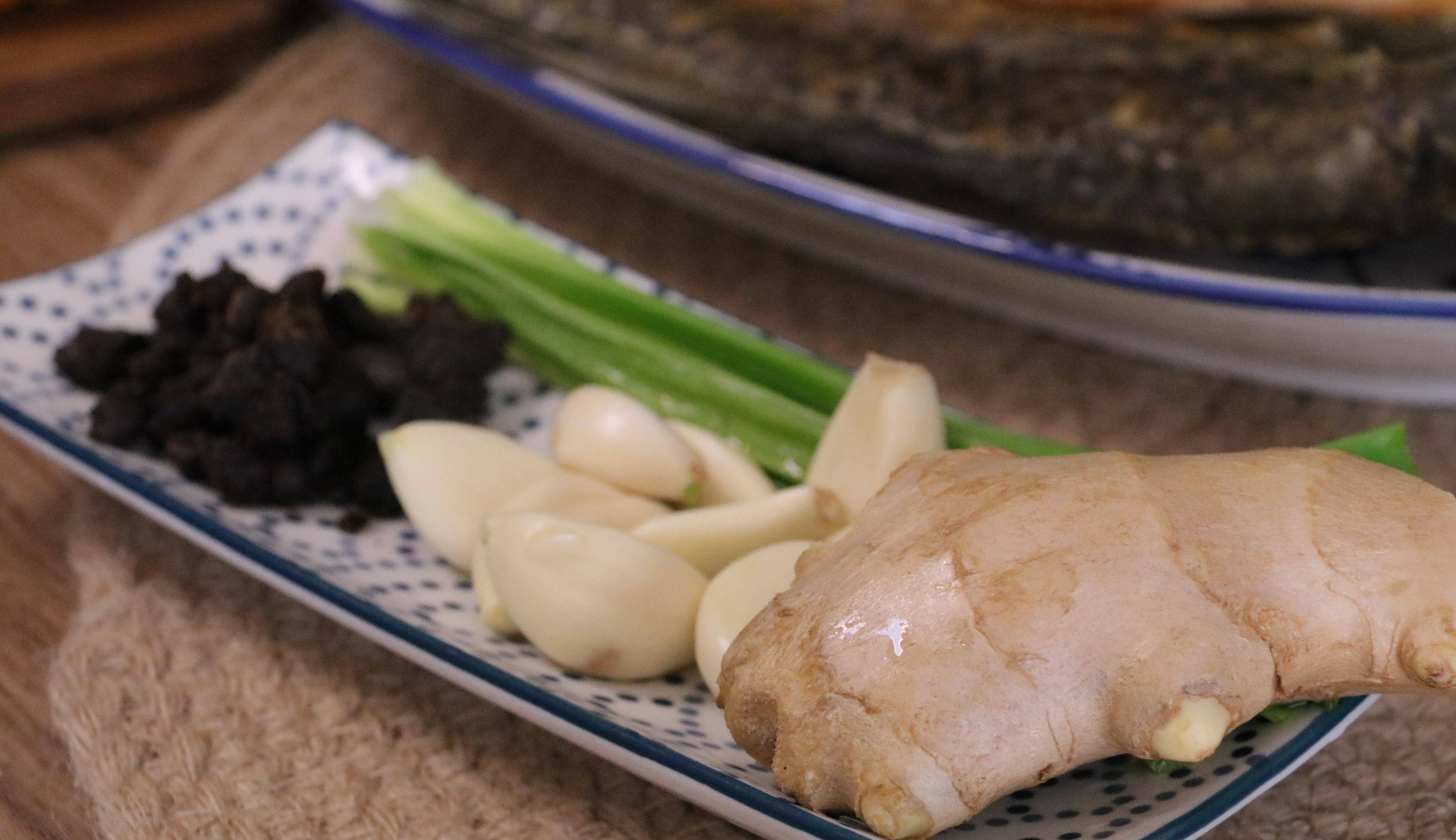 2、利用煮鱼的时间准备配料:将小葱切葱花,生姜一部分切片,另一部分与蒜子一起拍散后剁成碎末;
