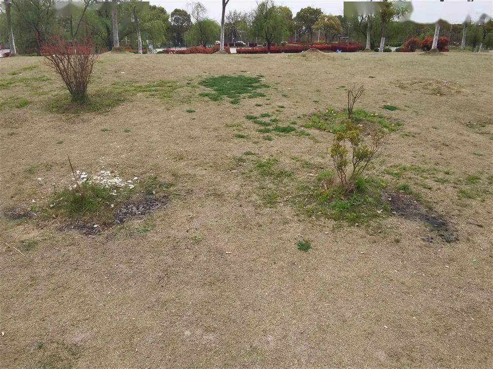 △浦东新区法治主题园也是“网红”露营地之一。图上为草坪上处处可见露营烧烤时炙烤导致的草皮枯焦。