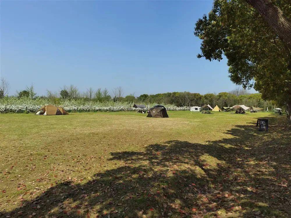4月2日周日上午,记者来到无山露营地查看。沿航南公路向东,经过一处加油站后,一块指示牌指引记者向北走,再沿着一条河边小道向西,两片油菜花田中间,挂着“上海农夫果园”牌子处就是无山露营地的入口。长条形的露营地内部,不同的功能区围着一段“U”形的河道布设,东侧是高大茂密的树林,林下空间被布置成了汽车营位,即车辆可以驶入停在树下,就近搭设帐篷,一些营位还铺上了木板平台。记者数了下, 仅树林侧,就已搭设了约30个帐篷。河道西侧是大块的草坪,是更为宽阔的草坪营位,可以容纳更多帐篷。露营地周围则环绕小河,隔河另一侧就是大片的农田和村宅。