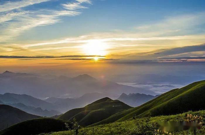 武功山日出,武功山空气湿度大,云多雾重,常常是山下天晴气暖,山上却云雾缭绕,气象万千。武功山云海非烟非雾,如诗如幻,气势恢宏,波澜壮阔;武功日出,照彻大千,冉冉上升之间,万顷红波,奔腾澎湃,犹如草甸在烧,天空在烧,让人感觉普照众生而入佛正道的意韵;武功日落,远去的夕阳显得凄美绝艳,让人感觉道学的厚重与飘逸,品尝出人生百年的时光如电。