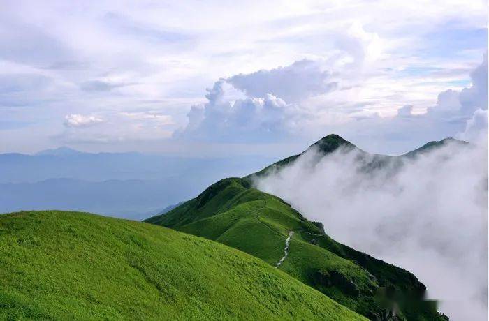 武功山的高山草甸海拔之高,面积之广在世界同纬度名山中都是绝无仅有的。10万亩草甸绵绵于海拔1600多米的高山之巅,穿云入雾,春夏绿油油,秋季金灿灿,冬天白皑皑,游人无需远赴边陲,便可领略北国风光,真可谓“天上草原、人间仙境、北国风光、绿色家园”,被专家称为“奇山伴草甸,天下一绝。”