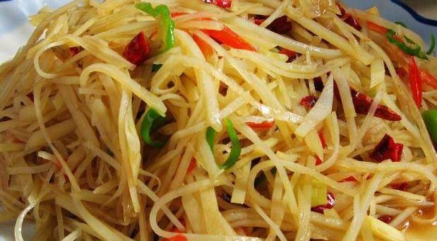 第五道菜是酸辣土豆丝,酸辣土豆丝是一种比较家常的菜,做法简单,把土豆切成细丝,然后开水中过一下,捞出来放凉水里过一下,控干多余的水。接着把辣椒爆香,放入土豆丝翻炒1分钟,加入盐和米醋在翻炒一小会就可以出锅了,这也是配米饭的好菜。