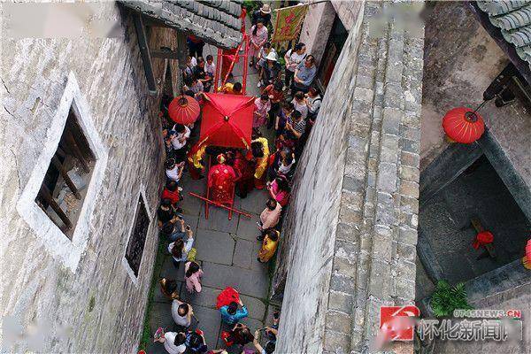 (在洪江古商城内游客沉浸式体验传统婚俗)