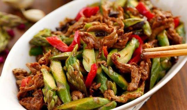 芦笋炒牛肉:芦笋炒牛肉是广东省传统的地方名菜,属于粤菜系。芦笋鲜嫩、牛肉香滑,其芦笋中含有芦丁、芸香甙、叶酸、硒等营养成分,搭配丰富蛋白质、钾、磷、维生素、烟酸成分的牛肉一起吃,不仅成分上不相克,还更具有食用营养价值。味道相当不错。