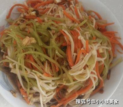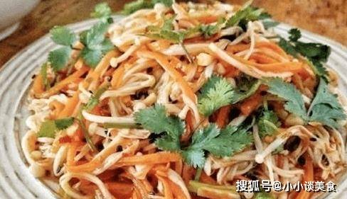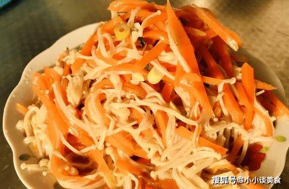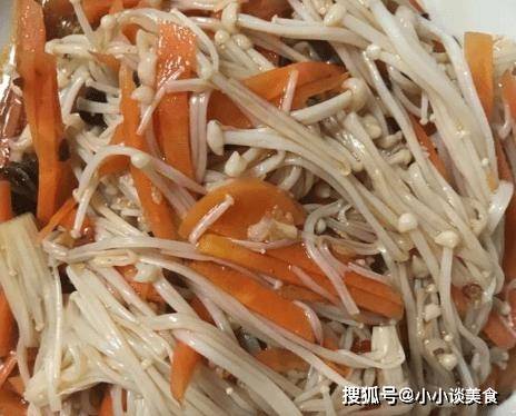 3、另起一锅油烧热,放入蒜末和黄豆炒香,关火加入金针菇、两勺生抽、两勺醋、一勺芝麻。油,半勺糖,还有云彩,在楼顶撒上一些小葱。所以胡萝卜和金针菇搭配在一起,5月份要多吃,减肥燃脂瘦肚子,皮肤也会变软。